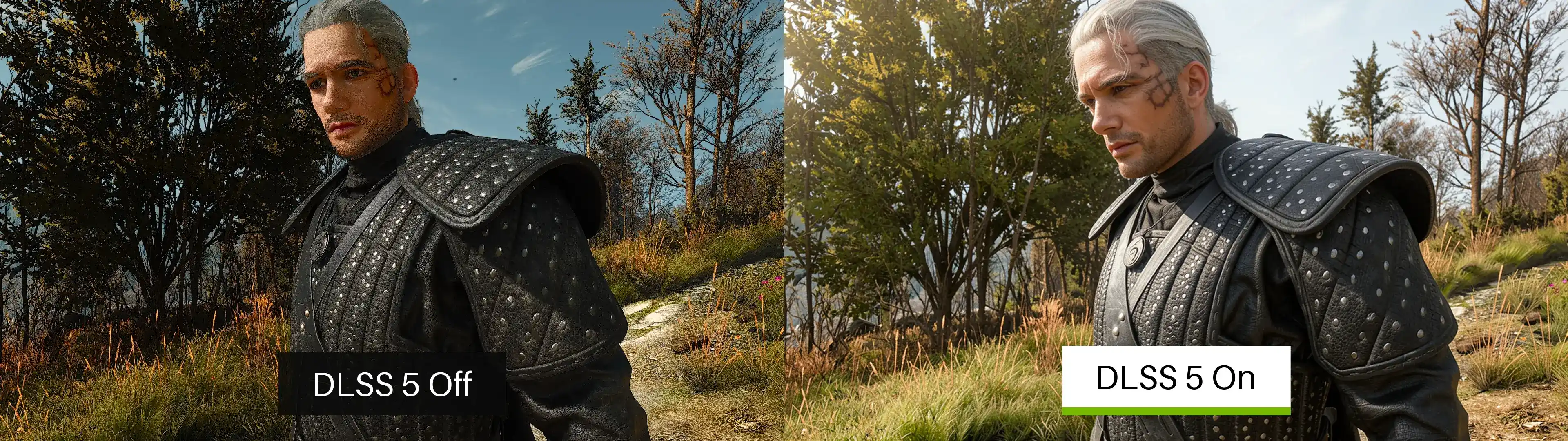 - Con DLSS 5 (simulado): El rostro se suaviza excesivamente, la piel adquiere un aspecto "plástico", los detalles se realzan de forma irreal, y el resultado parece un rendering generado por IA en lugar de un videojuego.